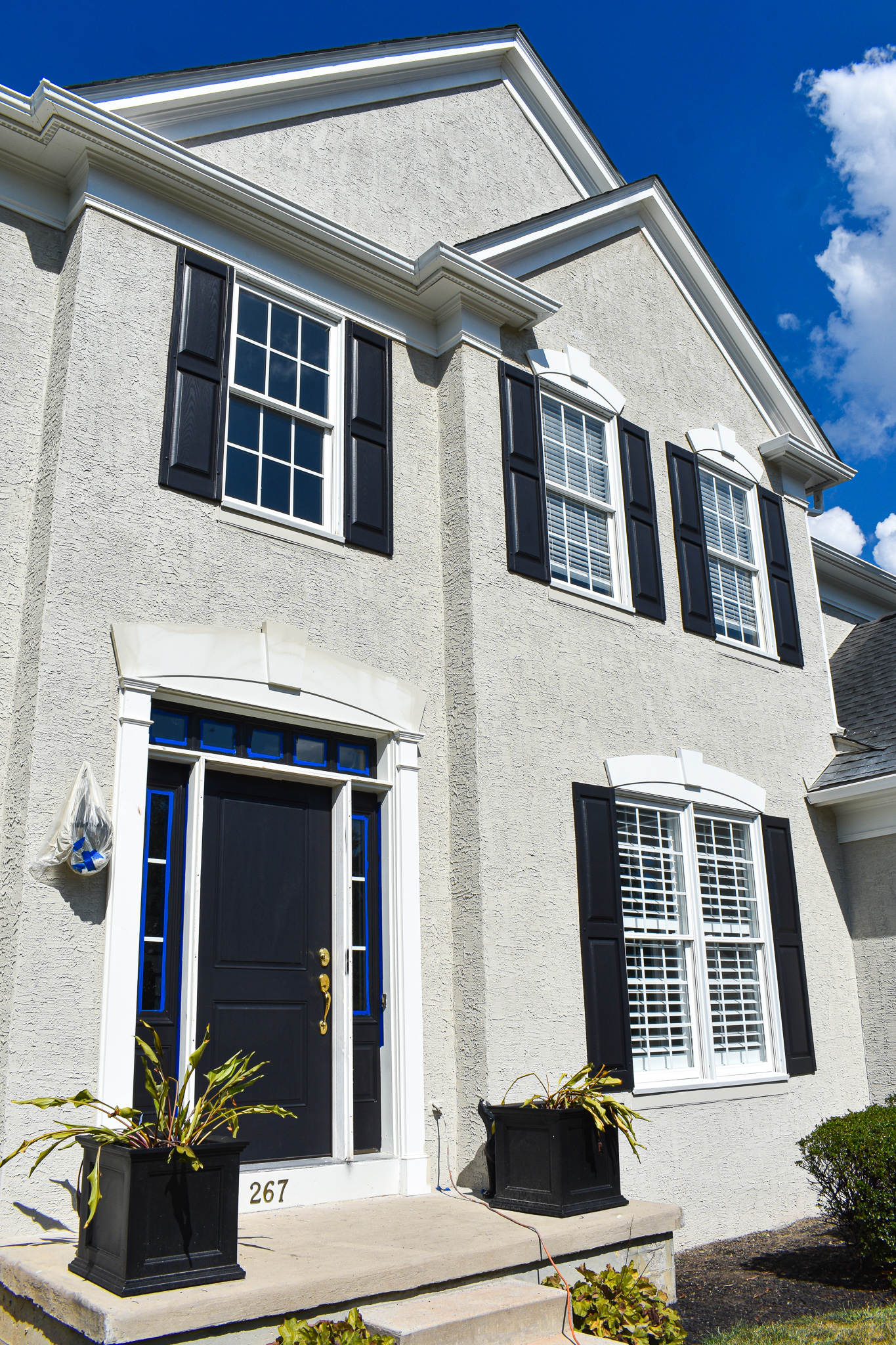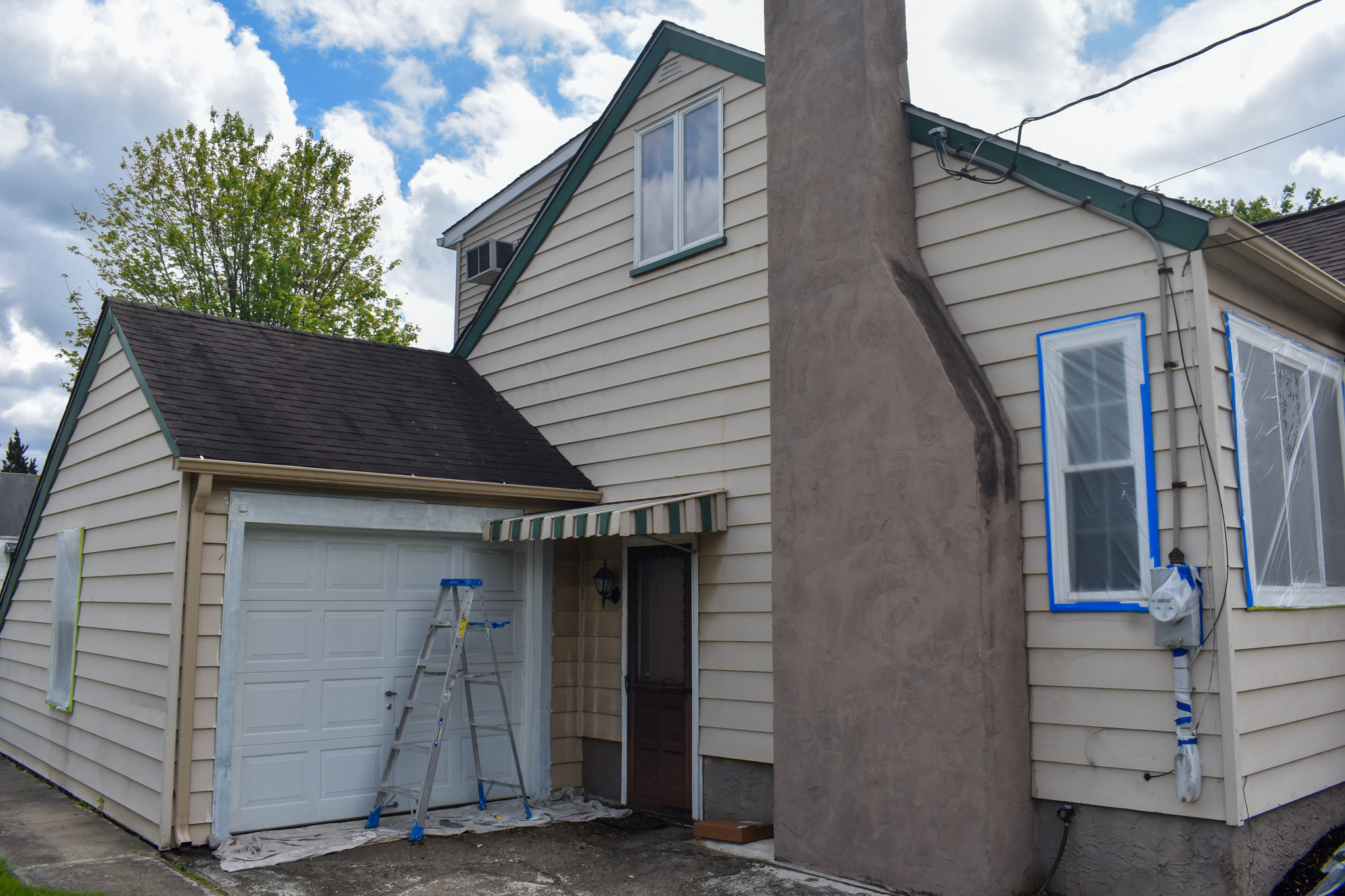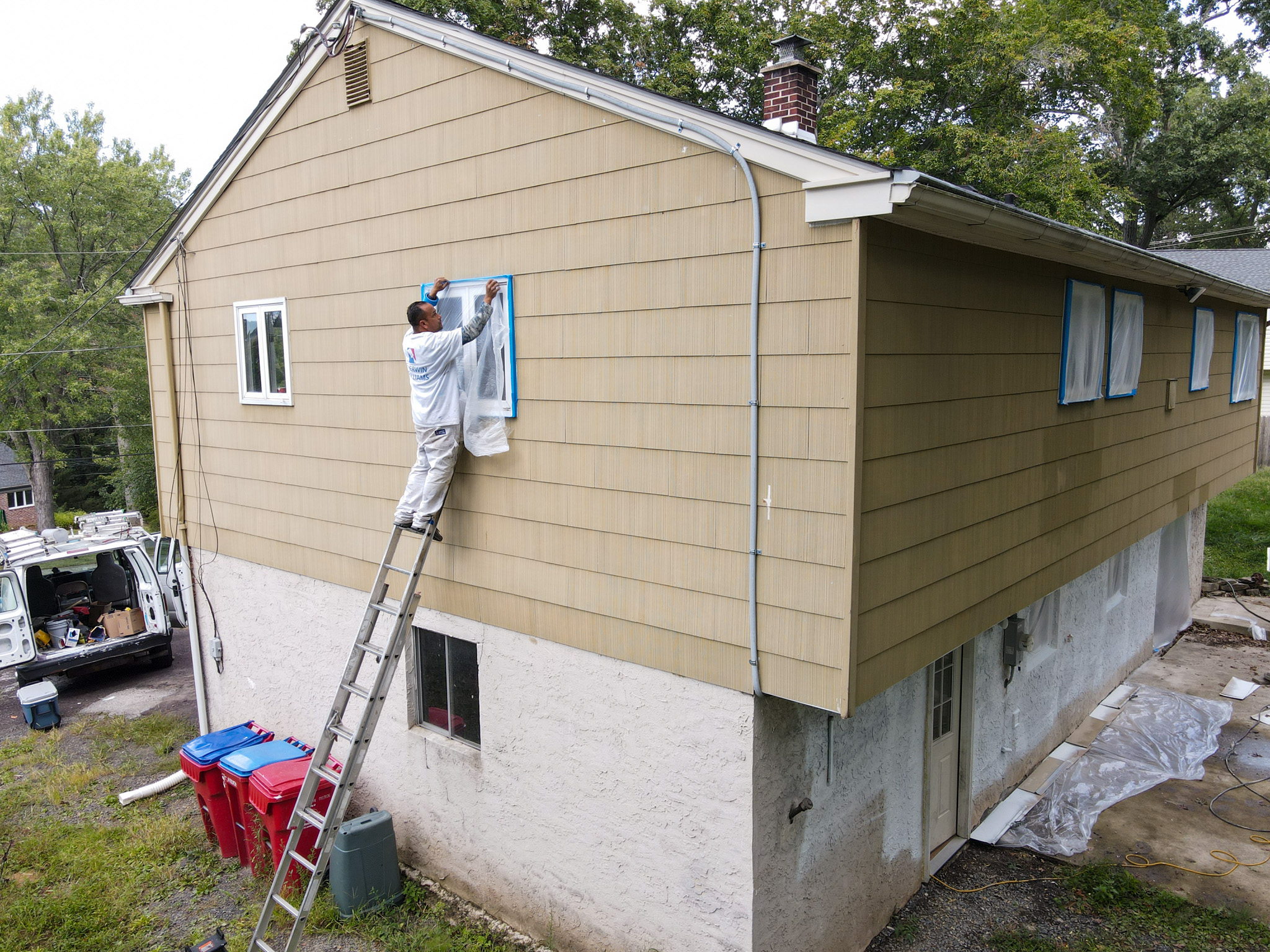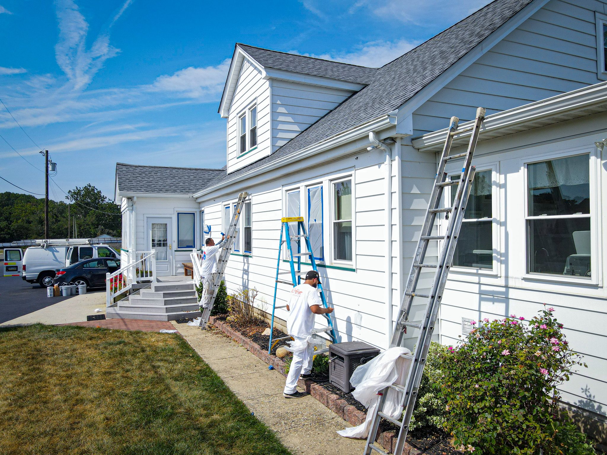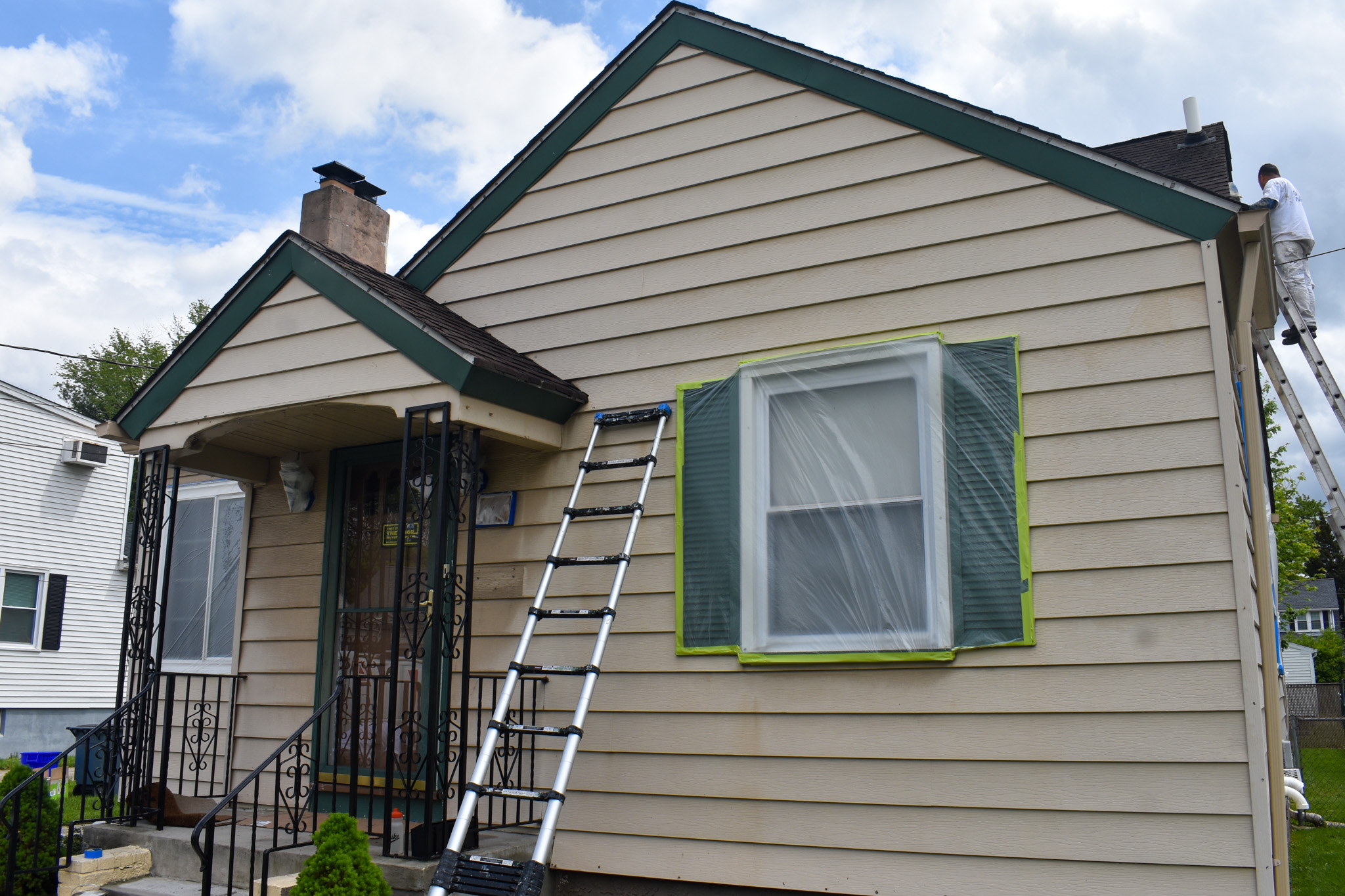 With our handmasking tool, we make sure to cover all windows, glass doors or other non-painted surfaces close to the house. With the help of drop cloths and cardboards, we protect the roof or awnings from getting undesired paint. We always make sure all cars are far away from the jobsite.